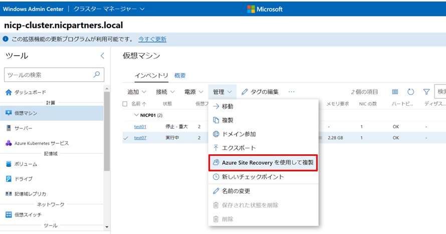 続いてWACサーバーでAzure Site Recoveryの対象とする仮想マシンを選択し、「Azure Site Recoveryを使用して複製」をクリックします。