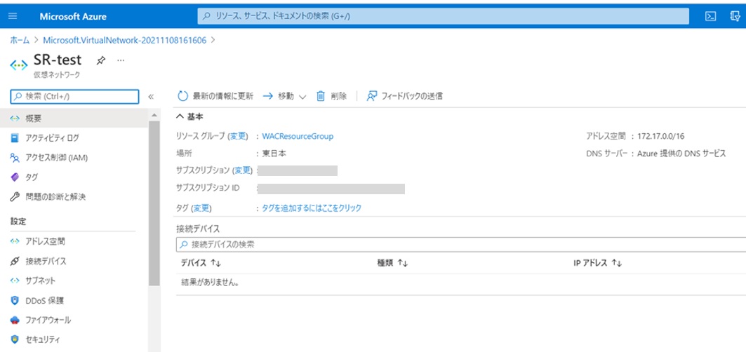 エラーを解消するために仮想ネットワークを作成しました。今回はSR-testという名前で以下のような設定で作成しました。