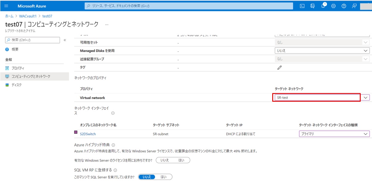 Azureにレプリケートされた仮想サーバーtest07で、ターゲットネットワークに作成した仮想ネットワークが選択します。