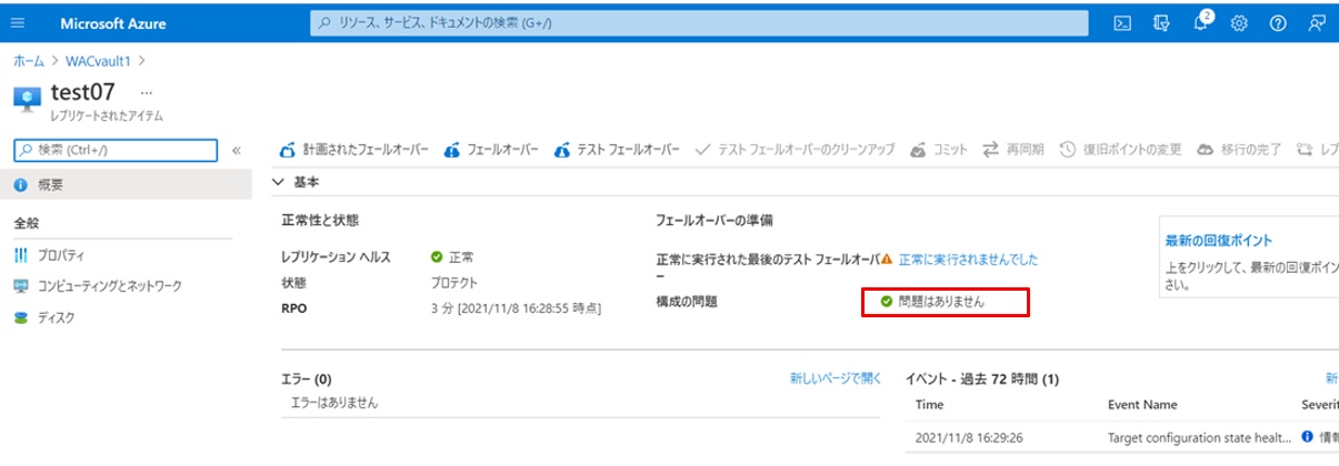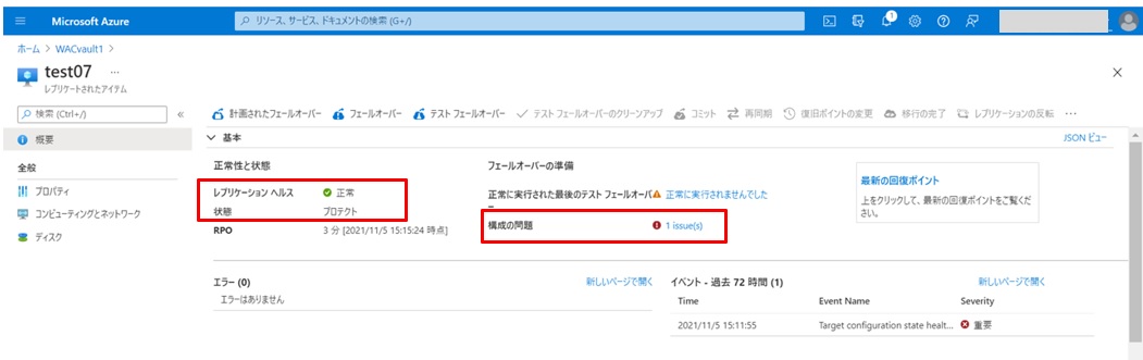 Azure Portalに移動して確認してみます。WACサーバーでAzure Site Recoveryを設定したtest07という仮想サーバーが確認できます。レプリケーションヘルスが「正常」で、状態が「プロテクト」状態であることが確認できますが、構成の問題が1つエラーになっているのでこれをクリックします。