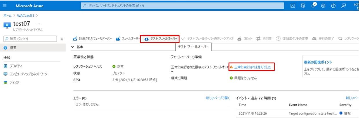 いよいよテストフェールオーバーしてみます。”正常に実行されませんでした”をクリックして実行します。