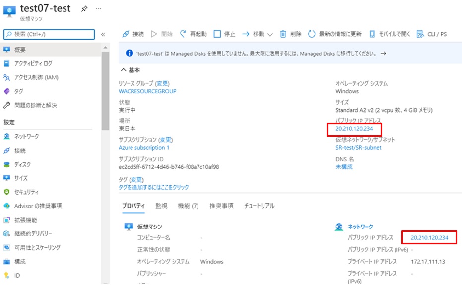 成功を確認したら、フェールオーバーした仮想サーバー(今回はtest07-testという名前)のネットワークインターフェイス(画面では”nic-test07-00-test”)にパブリックIPを設定して、リモートデスクトップでこのパブリックIPにアクセスしてみます。