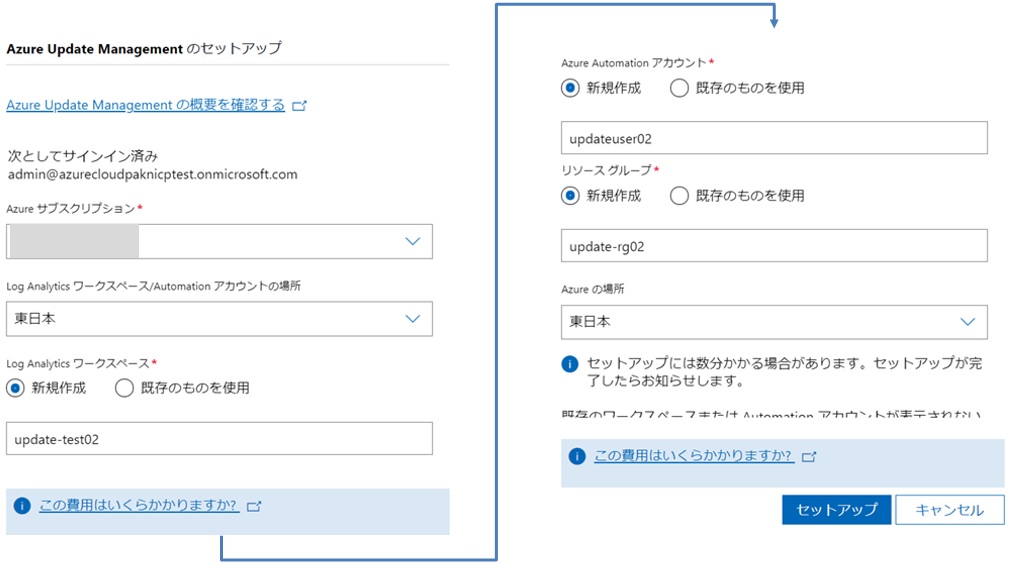 Azure Update Managementのセットアップ画面です。場所は「東日本」で、その他はすべて新規作成を指定してセットアップしました。