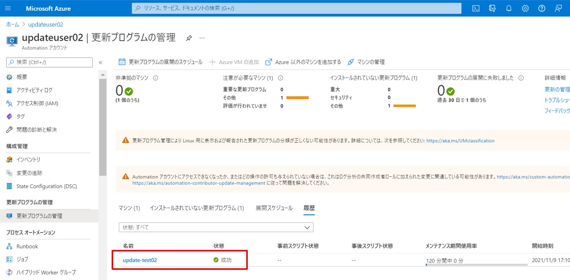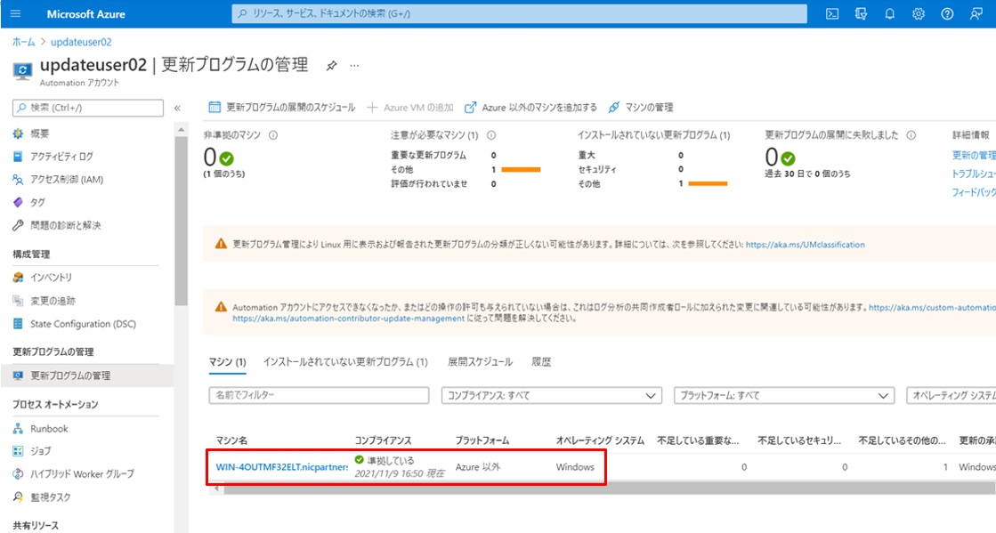 Azure Portalで確認します。作成したUpdate02というAzure Automationアカウントの「更新プログラムの管理」画面でサーバーが登録されていることが確認できました。