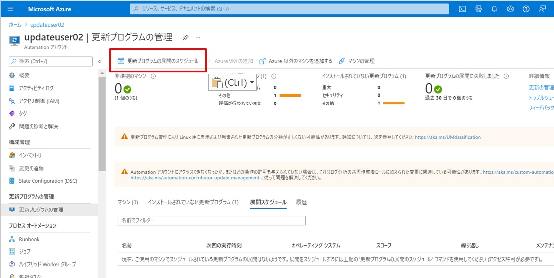 更新プログラムを適用してみます。「更新プログラムの展開スケジュール」をクリックします。