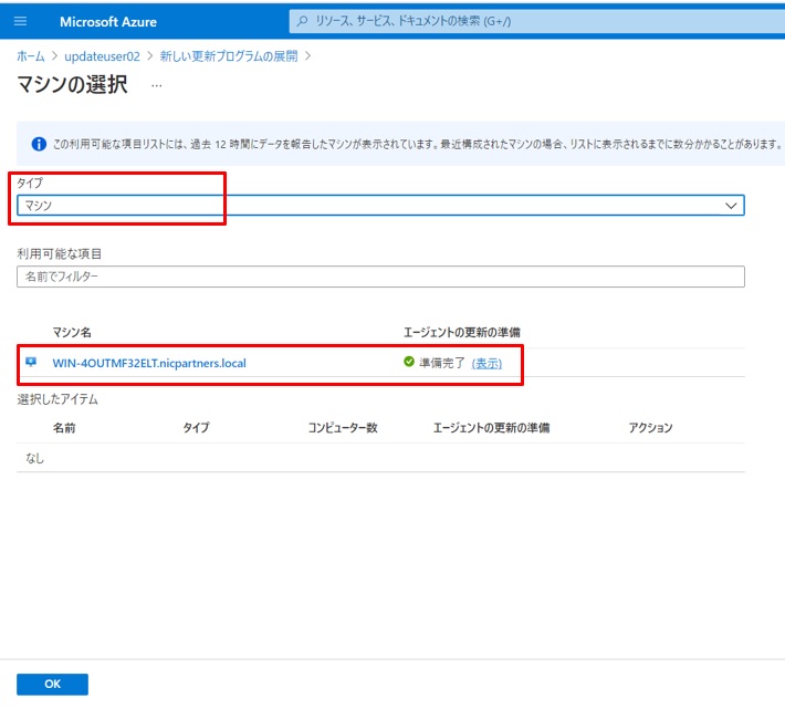 タイプとして「マシン」を選択し、登録されているAzure Stack HCI上の仮想サーバーが選択されていることを確認し[OK]します。