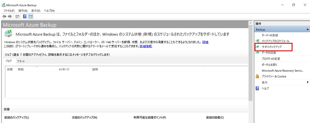 起動したAzure Backupアプリで[今すぐバックアップ]をクリックしてファイルをバックアップするジョブを追加します。