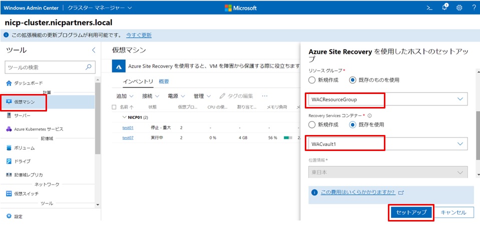まずWACサーバーにて、クラスターに接続してAzure Site Recoveryのセットアップを行います。リソースグループとRecovery ServiceコンテナはAzure Backup検証で作成した既存を指定し、[セットアップ]をクリックします。