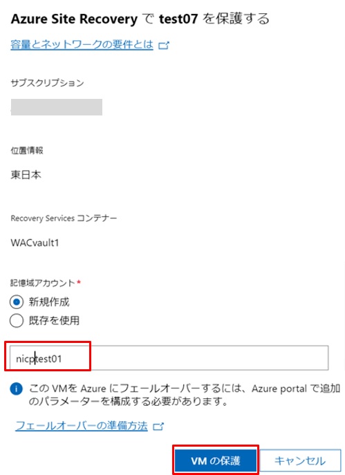 Azure Site Recoveryの設定画面となるので、記憶域アカウントを新規の名前で指定して[VMの保護]をクリックします。以上でWACサーバー側での設定は完了です。