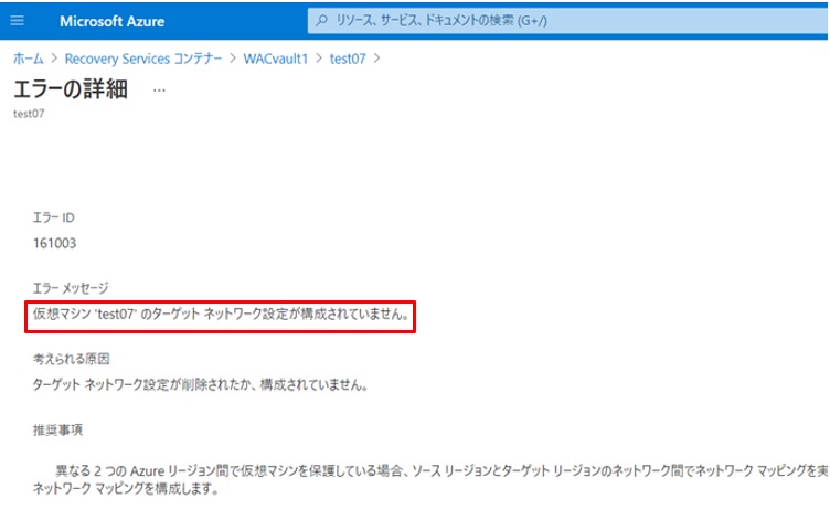 エラーの詳細が確認できます。ターゲットネットワークが構成されていないことが原因のようです。