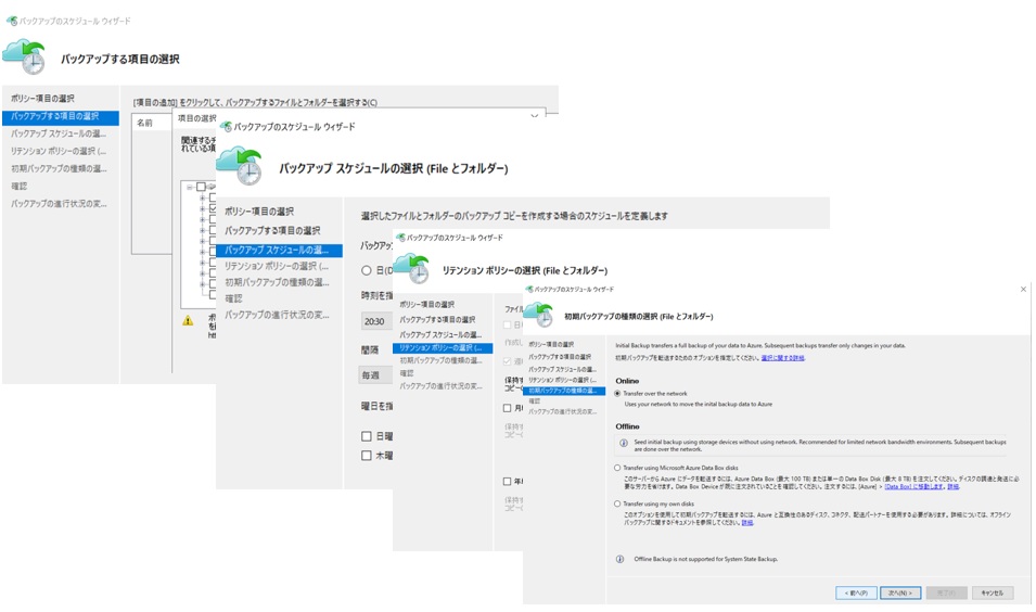 Azure Backupの設定を行います。以下のように設定しました。