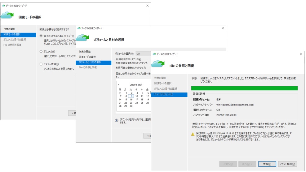 リストアの種類として「個々のファイルおよびフィルダー」を選択して、次の画面でいつのバックアップから戻すか選択してリストアします。リストアが完了すると回復ボリュームとして空いているドライブ(今回はEドライブ)にマウントされます。