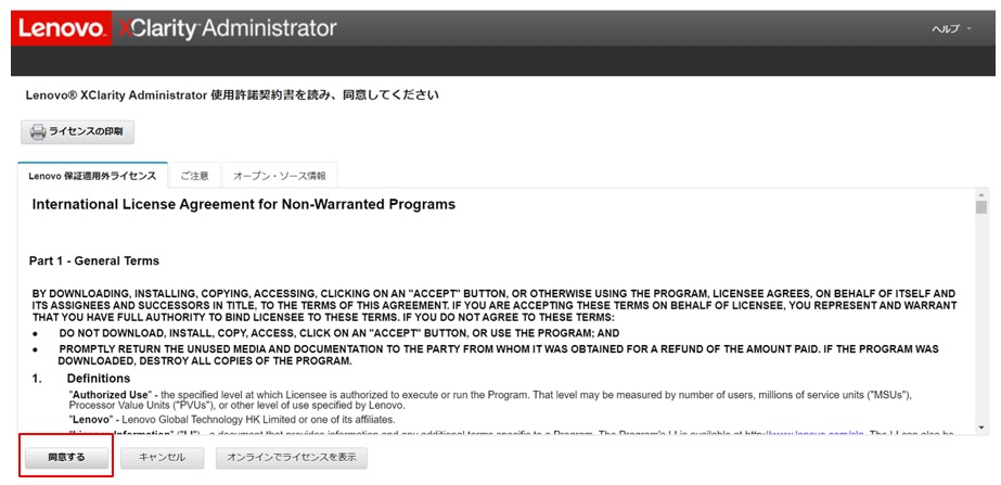 まずはライセンス使用許諾からです。内容を確認し[同意する]をクリックします。