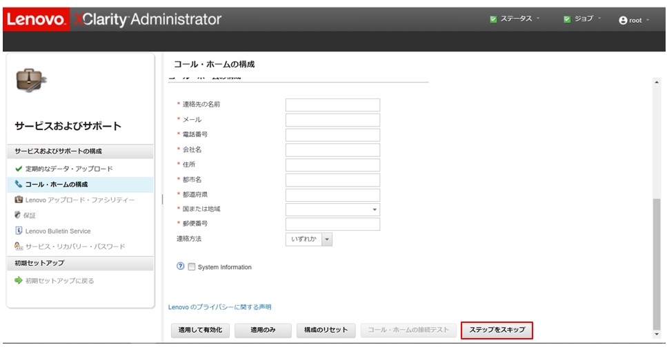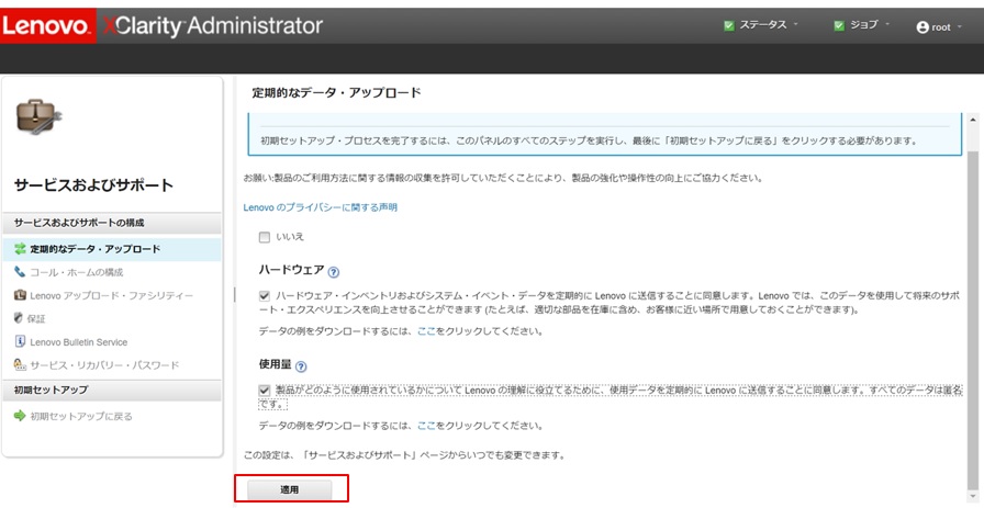 3つ目の[Lenovoアップロード・ファシリティー]の設定画面です。Lenovoサポートからサービス・データのアップロードを指示された場合のアップロード設定を行います。こちらも今回の検証では利用しないのでスキップしました。
