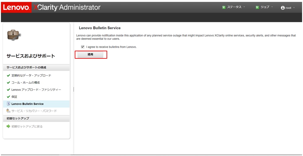 5つ目の[Lenovo Bulletin Service]設定画面です。Lenovo がセキュリティや新バージョンリリースなどの情報をXCLAに送信するのを許可する設定です。デフォルトで許可する設定になっていますのでそのまま[適用]をクリックします。