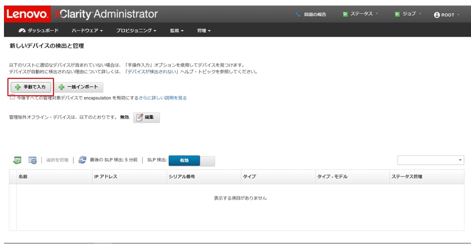 [新しいデバイスの検出と管理]画面で、MXノードのXClarity Controller(管理プロセッサのこと。以下、XCC)のIPアドレスを手動登録します。