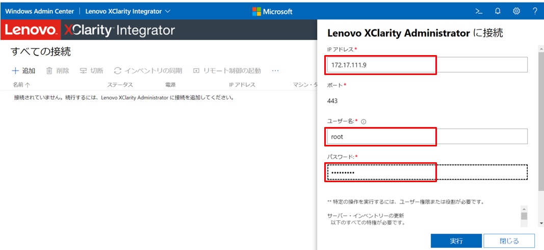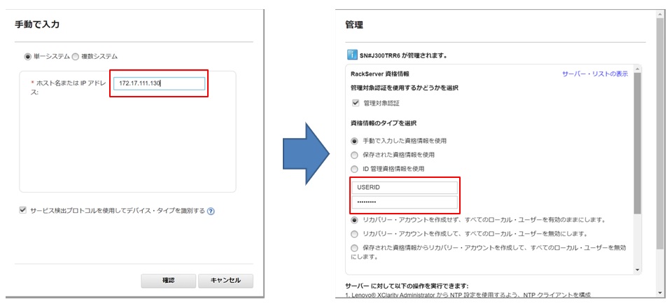 LXCAを登録します。LXCAのIPアドレスと初期セットアップで登録したスーパーバイザーアカウントで接続します。