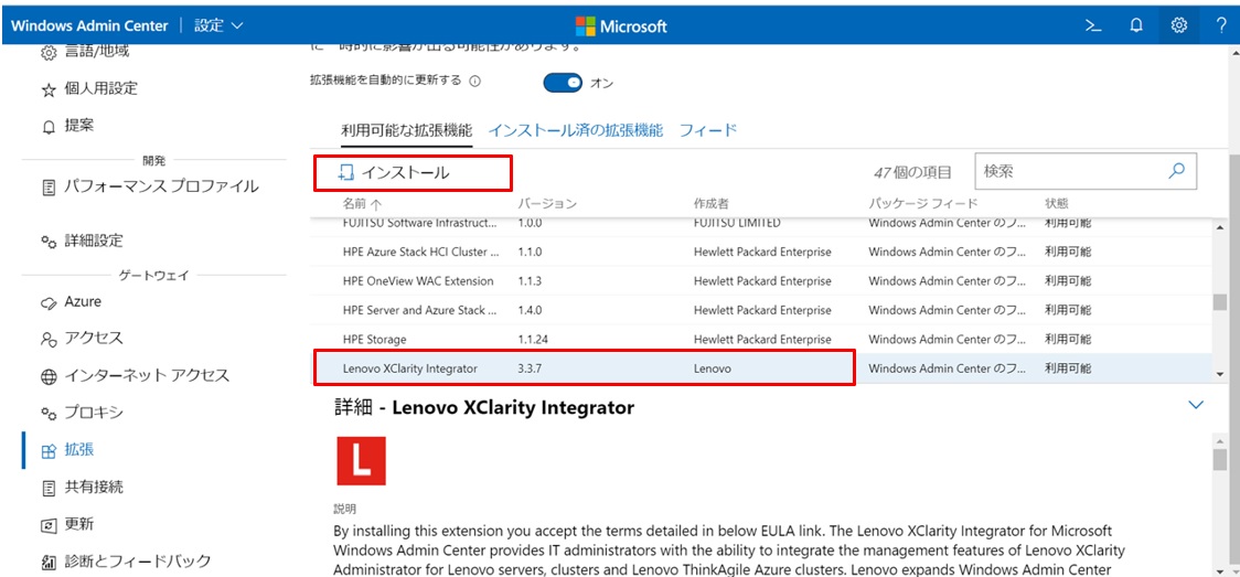 左ペインの[拡張]を選択し、右ペインで[Lenovo XClarity Integrator]を選択してインストールします。