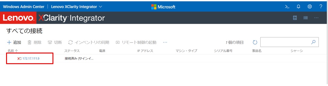 接続が完了するとLXCAが[接続済み]というステータスで確認できますのでこれをクリックします。