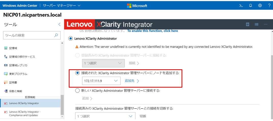 次にMXノードをLXCAに追加します。画面ではnicp01というMXノードに接続しています。拡張機能がインストールされたので、ノードの左ペインに[Lenovo XClarity Integrator]が選択できるようになったのでこれを選択して右ペインで”接続されたXClarity Administrator管理サーバーにノードを追加する”を選択してLXCAのIPアドレスを指定します。