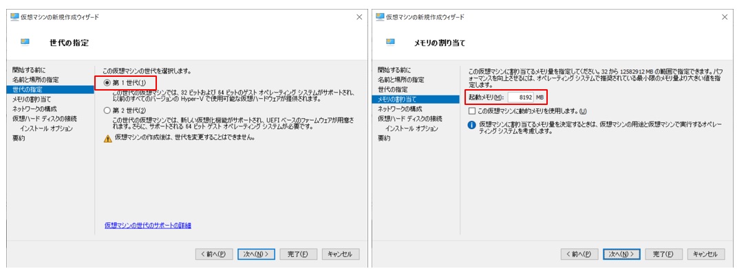 仮想マシンの世代を「第一世代」、次の画面でメモリ割り当てを8GBにします。このあたりはLXCAのマニュアルを参考にしました。