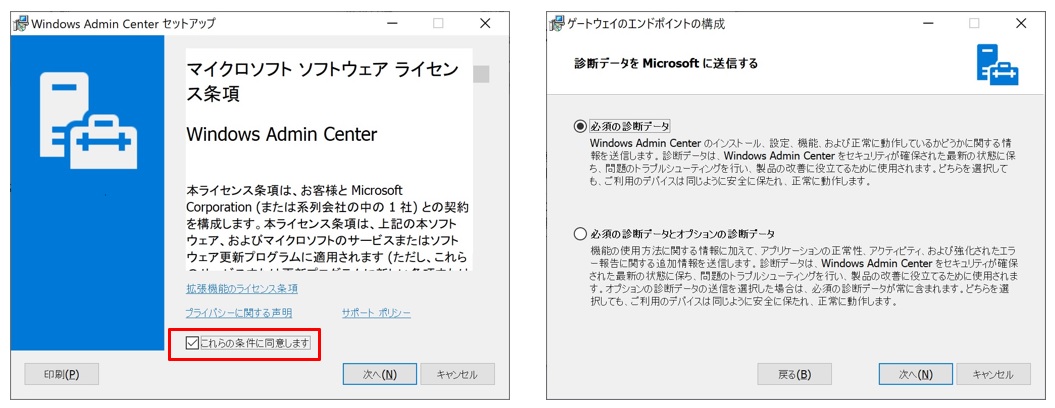 最初の画面で[使用許諾契約書に同意します] にチェックを入れ、次に進みます。診断データのマイクロソフトへの送信はデフォルトのままで進みます。