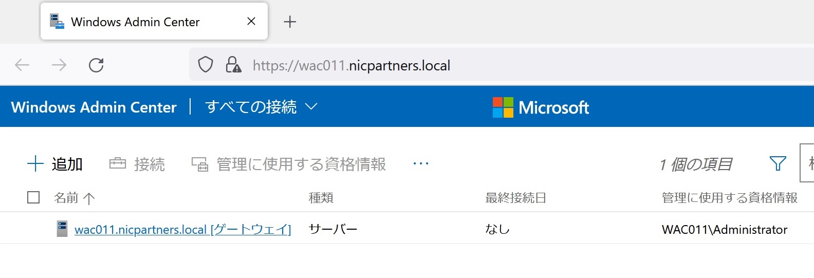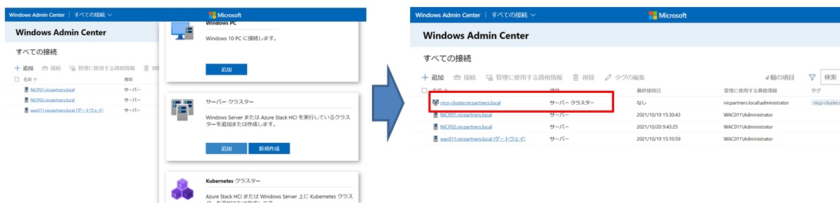 MXサーバーの2台をWACに追加し、続いて第一回で作成したnicp-clusterという名前のWindowsサーバークラスタを追加します。追加が完了すると以下のように確認できますのでこれをクリックして接続します。