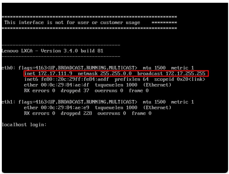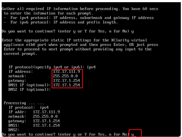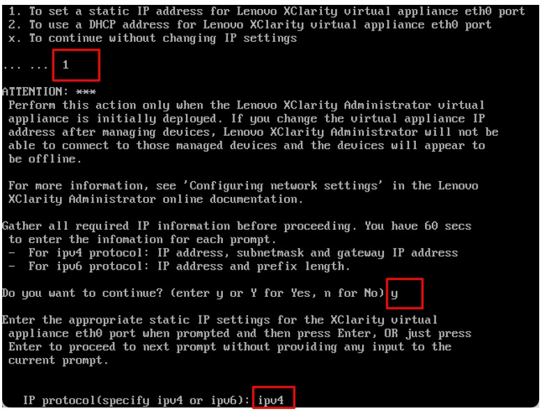 起動が完了すると、仮想マシン画面上に以下のようにネットワーク設定を選択する画面が表示されるので”1. To set a static IP address for Lenovo XClarity virtual appliance eth0 port”を選択して固定IP設定に入ります。