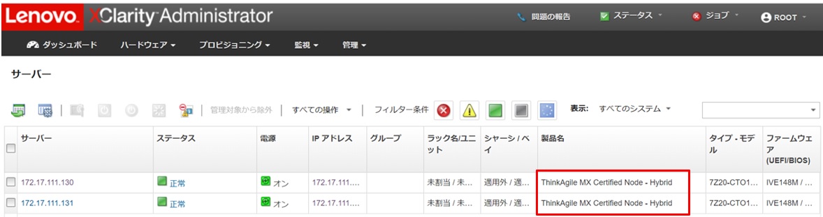 するとWAC上のLenovo XClarity Integrator画面にMXノードが追加されます。以下はMXノード2台の登録が済んだ状態です。ThinkAgile MXと正しく認識されていることが確認できます。