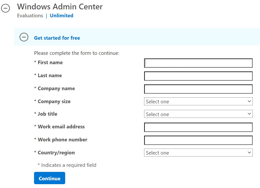 WACのホームページからインストールファイルをダウンロードします。ダウンロードには以下のフォームで必要情報を入力し[Continue]をクリックするとダウンロードが始まります。