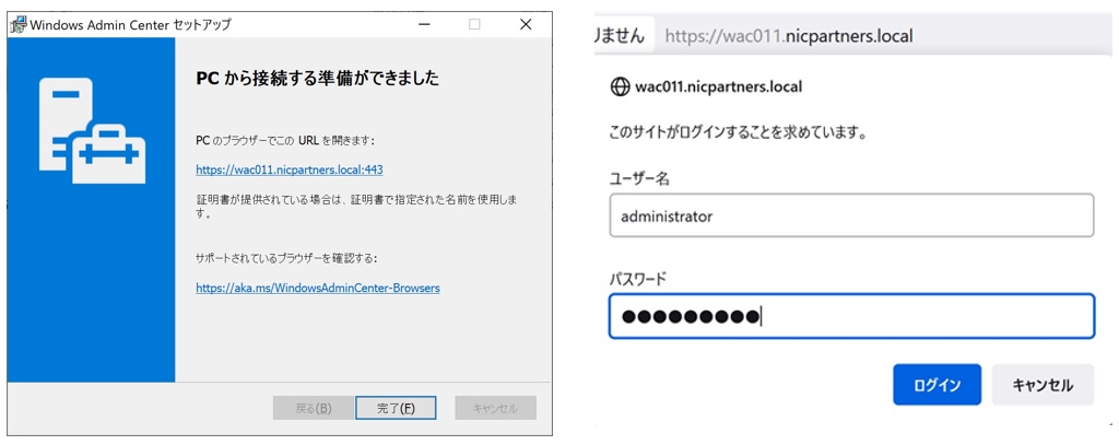 インストールが完了したら、表示されているURLに接続して管理者アカウントでログインします。