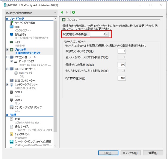 仮想マシン後に1箇所設定を変更します。作成した仮想マシンの設定画面で、仮想プロセッサの数をデフォルトの1個から2個に変更します。これも上記LXCAマニュアルに書かれている内容です。