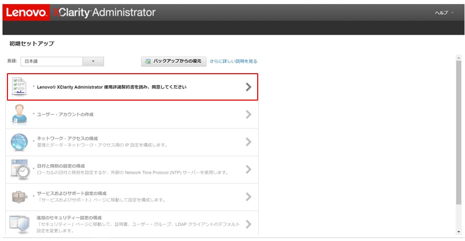 ブラウザでLXCA仮想マシンのIPアドレスに接続するとライセンス使用許諾から始まり各項目を順番に設定していくようになっています。では、早速設定していきましょう。