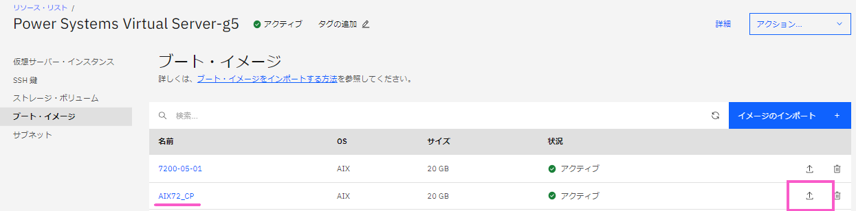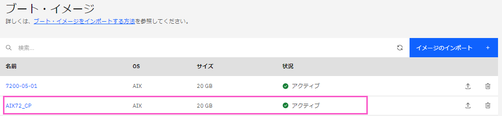 ※「AIX72_CP」の上に表示されている「7200-05-01」は、インスタンス「AIX72-test」作成時にできるイメージです。