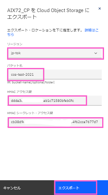 「AIX72_CPを Cloud Object Storage にエクスポート」の画面が表示されます。