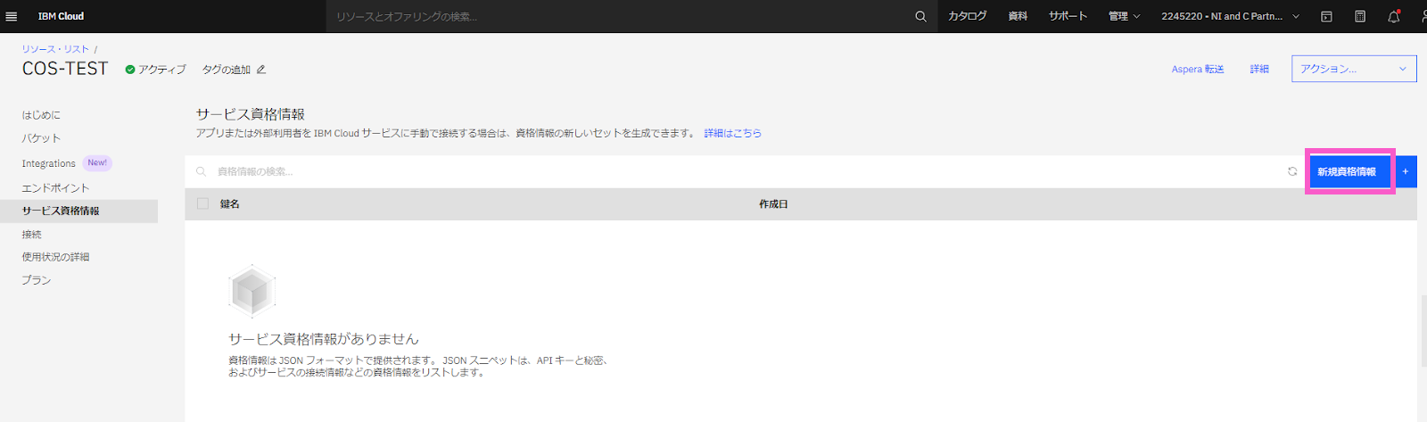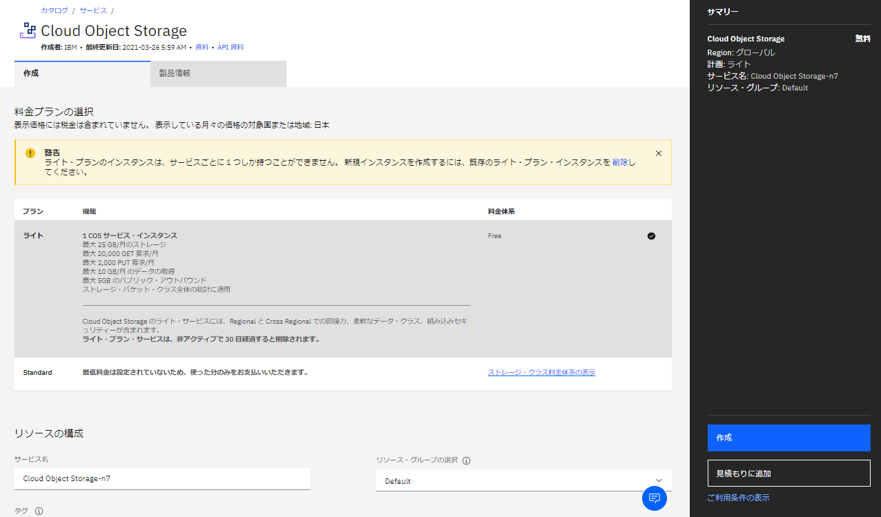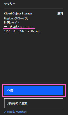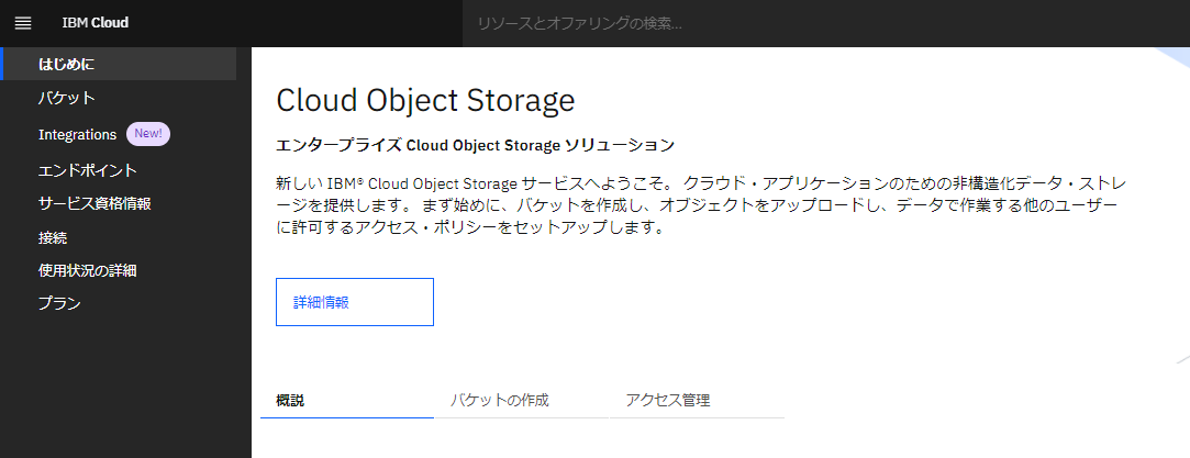 2) で取得したバックアップをIBM Cloud Object Storageにエクスポートする前に、IBM Cloud Object Storage のサービスを作成する必要があります(IBM Cloud Object Storage は、これ以降、ICOS と記載します)。
