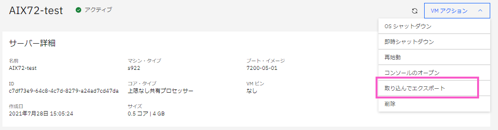 ・「サーバ詳細」の右上に表示されている「VMアクション」のプルダウンをクリックし、「取り込んでエクスポート」をクリックします。