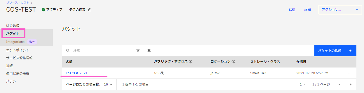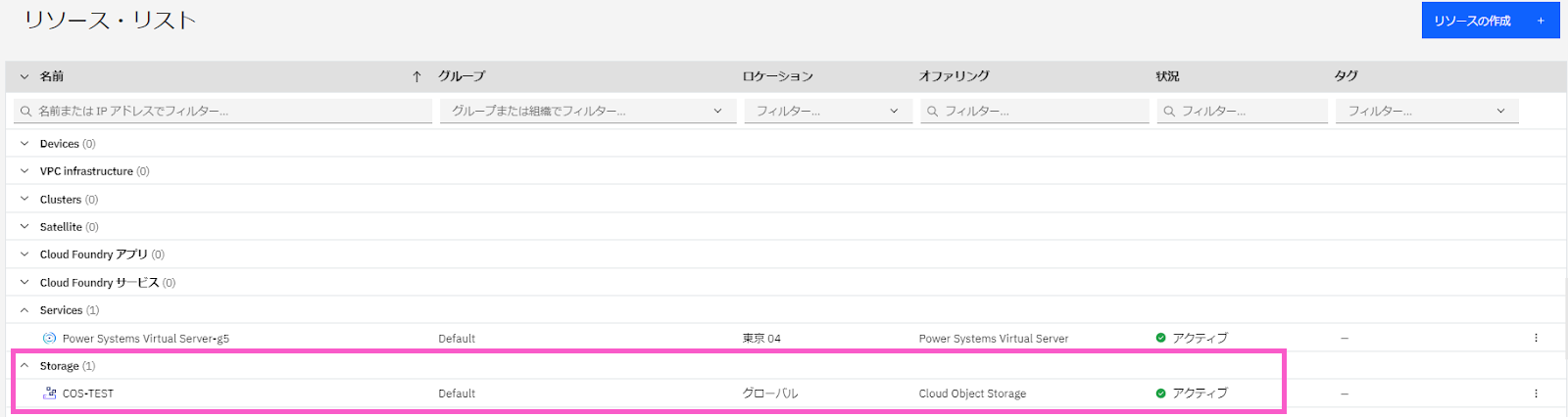 ・リソース・リストにリストされた「COS-TEST」をクリックします。