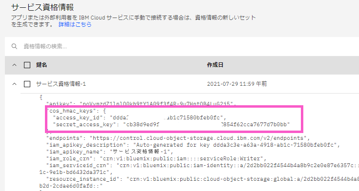 ・「cos_hmac_keys」の情報は、ICOSへバックアップデータをエクスポートする際に利用するのでコピペしておきます。