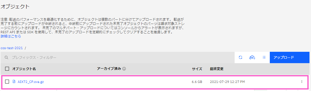 エクスポートは約17分程度で完了しました。約6.6MB/秒 の転送速度です。 ICOSはIBM Cloud の x86側のサービスを利用しているのもあり、転送速度はちょっと遅いですね。