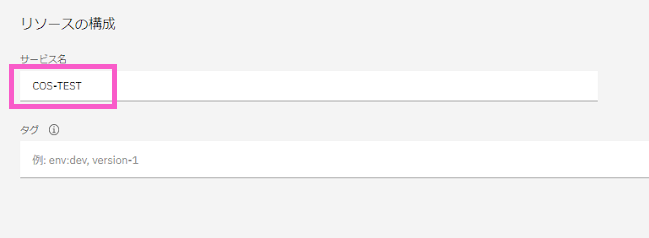 ・「リソースの構成」の「サービス名」の欄に任意のサービス名を記載します。今回は「COS-TEST」という名前にしました。