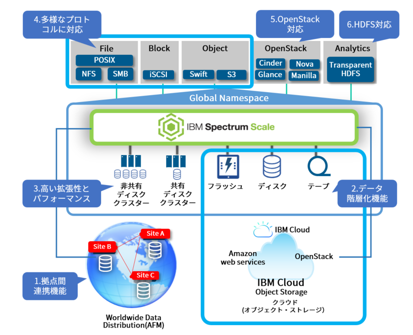 あらためて IBM Spectrum Scale の特長を紹介すると、次のようになります。