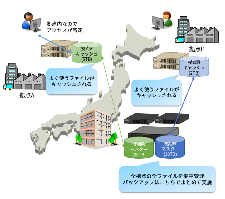 全拠点の全ファイルを、本社データ・センターで集中管理します。IT担当者のいない遠隔地拠点では、バックアップ運用は行わず本社データ・センター側でまとめて実施します。遠隔地拠点では、よく使うファイルだけがキャッシュされるようにします。