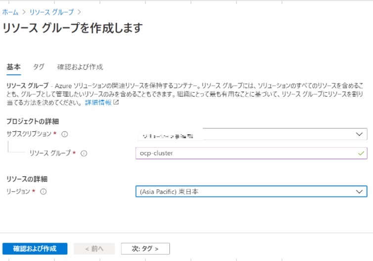 まずリソースグループを作成します。今回は「ocp-cluster」という名前のリソースグループを作成しました。