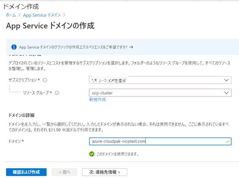 今回は「azure-cloudpak-nicptest.com」という名前で作成しました。事前にレジストラからドメイン名を購入せずに作成できるかやってみましょう。