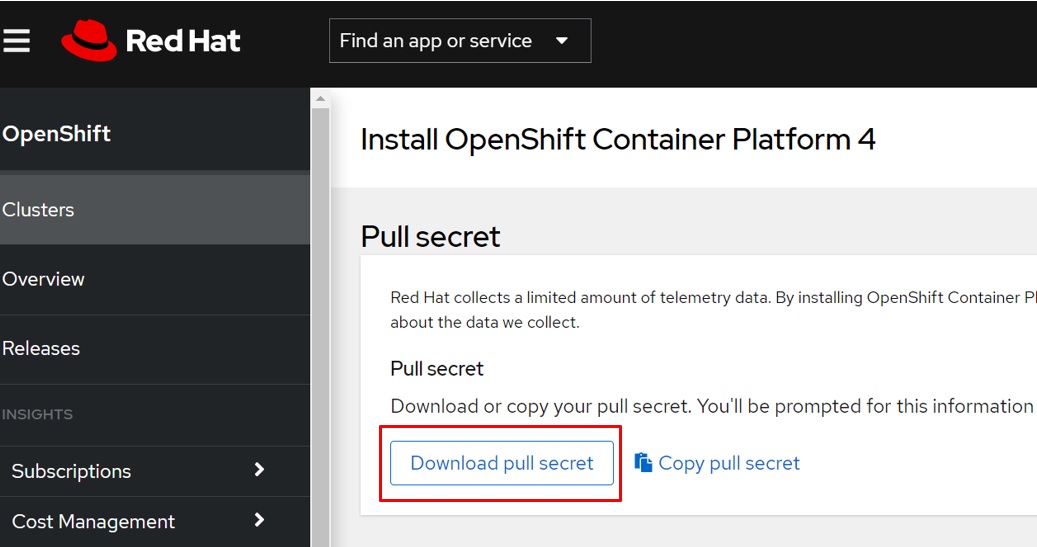 Red Hat OpenShift Cluster Manager サイトの「Pull Secret」ページから、インストールプルシークレットを/home/user01/os45フォルダにダウンロードします。