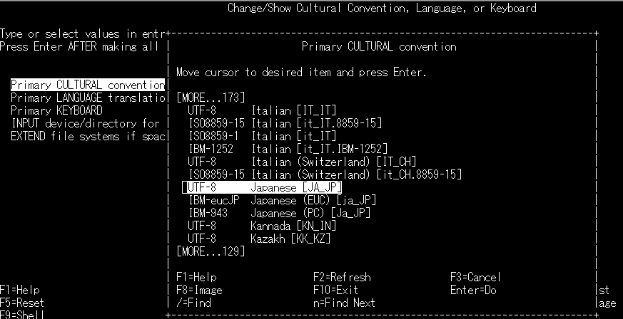 ・リストから「UTF-8 Japanese [JA_JP]」を選択し、Enter を押します。