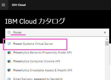 ・カタログの画面で Power Virtual Server を選択します。検索バーに「Power」と入力すると「Power Virtual Server」が一番先頭に出てきますので「Power Virtual Server 」を選択します。