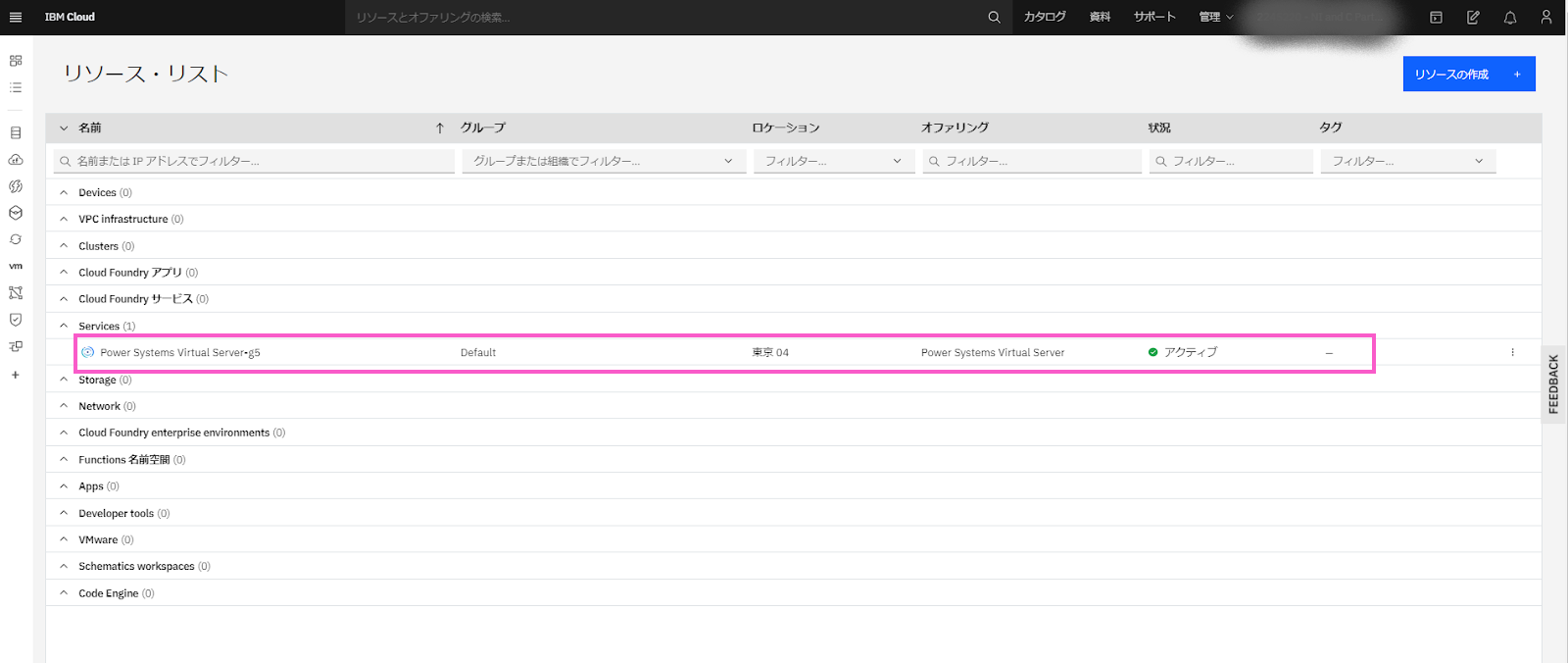 画面は「リソース・リスト」に自動で変わり、数分待つとリソース・リストの「Services」の欄に「Power Virtual Server 」が追加されました。