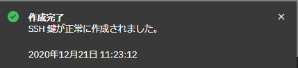 以下のコメントが出力され、SSH鍵が正常に作成されました。